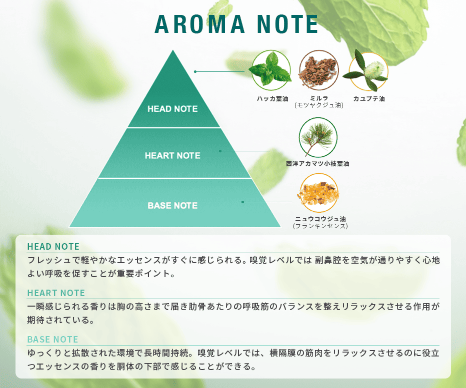 全成分:ハッカ葉油、西洋アカマツ小枝葉油、カユプテ油、ニュウコウジュ油(フランキンセンス)、ミルラ(モツヤクジュ油)