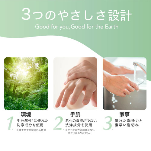 | 使用量の目安 | 水1Lに対して1~2mLまたは、ぬれたスポンジ等に適量(2~3mL)をとり、軽く泡立ててご使用ください。汚れの量、種類によって調整してください。(料理用小さじ1杯は約5mL) |