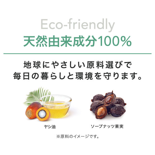 | 全成分 | アルキルグルコシド、重炭酸ナトリウム(重曹)、重炭酸カリウム(炭酸水素カリウム)、クエン酸ナトリウム、キサンタンガム、ソープナッツ果実エキス、エコカエキス |