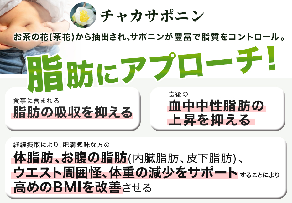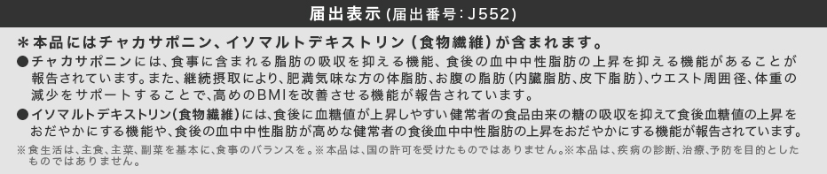| 原材料名 | イソマルトデキストリン(国内製造)、緑茶エキス、茶花エキス、サージ発酵エキス(サージ果実、大豆、納豆菌)、穀類発酵エキス(玄米、黒米、赤米、大麦、もち麦、はと麦、あわ、ひえ、きび、たかきび、大豆、黒豆、小豆、トウモロコシ、納豆菌)、アフリカマンゴノキエキス、植物性乳酸菌末(殺菌)、白インゲン豆エキス/シクロデキストリン、キトサン、(一部にかに・大豆を含む) |